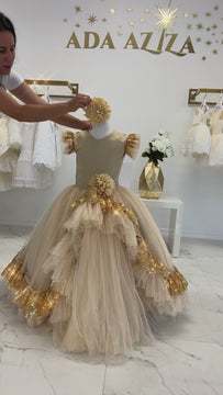 This beautiful dress is made with extremely soft tulle with silk satin top. The outfit is smoothly double lined from top to bottom with cotton perfect for baby and children sensitive skin. Each dress comes with a matching headband.