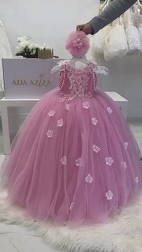Magdalene dress is perfect for a stand out occasion. Perfect for a grand birthday party, or a beauty pageant. Extremely soft layers of tulles with hand stitched 3D flowers. Pearl and feather details added to give it an extra pop. This is definitely not your average couture.